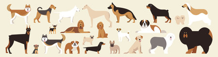Different breed dogs set. Isolated dogs on light background. Flat cartoon. Vector illustration. Collection
