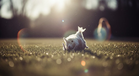 A small, adorable scruffy dog takes a quiet moment to rest on a soft, plush carpet. Bathed in the warm glow of afternoon sunlight, its expressive eyes gaze forward, a favorite orange ball nearby. This image captures a peaceful, heartwarming scene of domestic life and the simple joys of a pets companionship.