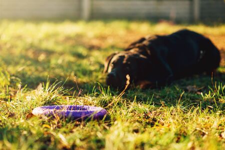 cute brown dog is on his master's lap in the spring garden on the green grass and looks up faithfully