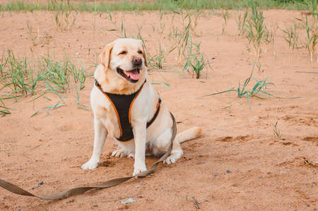 Labrador retriever dog on a walk. A dog in ammunition facing the camera on a background of grass.