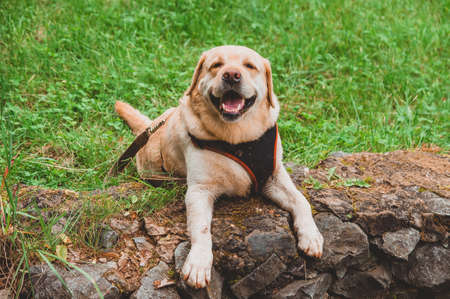 A Labrador Retriever in a harness lies on the grass and laughs. The dog rests on a walk in the heat of summer.