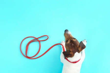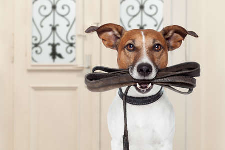 jack russell dog waiting a the door at home with leather leash in mouth , ready to go for a walk with his owner