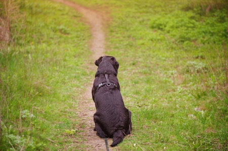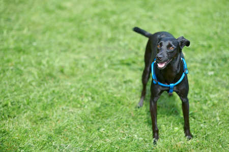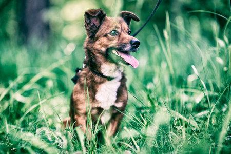 Dog sit on the grass in the outdoor garden. dog on the walk in the park outdoor.