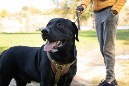 adult black labrador in parks with a man on a walk in the spring in ukraine in the afternoon