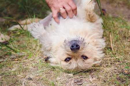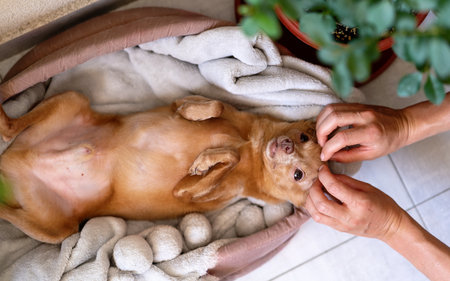 Small charming dog Toy Terrier lying on back and enjoying massage of his head. Pet owner doing a massage of head of pet.