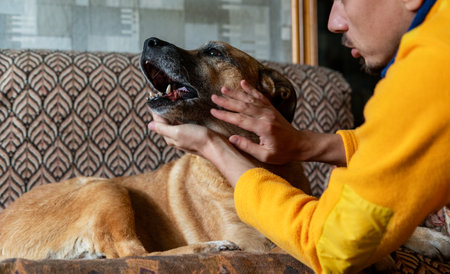 Person in a yellow sweater gently examines senior dog's mouth while the pet lies on a patterned sofa. The dog shows calmness and trust during the inspection process, pet care and love