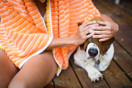 Stay home. Pet care. Woman taking care of mixed breed dog on the sofa at home