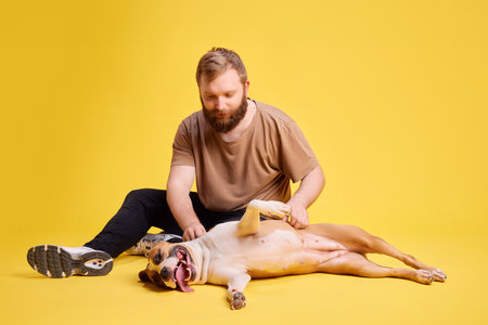Young man posing lying on floor and hugging his lovely, relaxed American Staffordshire Terrier against vibrant yellow studio background. Concept of animals and their owners, friendship, pets care.