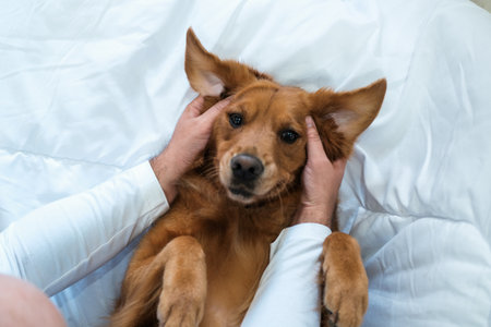 Portrait of a Golden Retriever dog lying on its back on a bed with its ears raised up. The owner hands hug the dog head. Happy and calm pet. Funny dog on the bed.