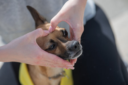 Female hand touching while stroking a cute little shy toy terrier dog. Care and tenderness for a pet