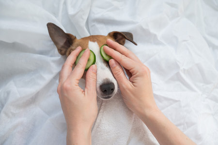 Dog spa. Woman places cucumbers on Jack Russell Terriers eyes