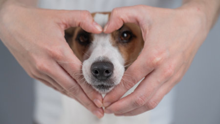 Owner holds her hands in the shape of a heart near the face of her Jack Russell Terrier