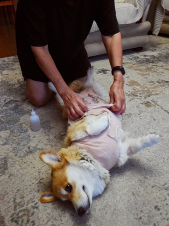 Stay home. Pet care. Man cleaning ears of his shepherd dog