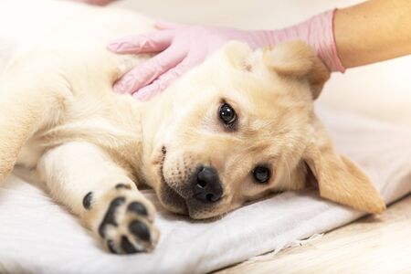 A white labrador dog lies on a wooden floor and people pat on the head. Close-up. Dog is a friend of man. Trust and friendship