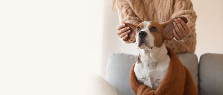 Woman playing with cute Beagle dog at home on autumn day. Banner design