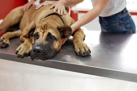 owners of the dog calm down, hug the dog before the examination in vet clinic, feel love and friendship. dog and people concept