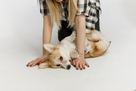 woman with a pet corgi dog plays and teaches furry friend commands inside the house