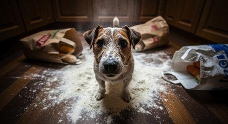 Mischievous jack russell terrier dog covered in white flour, standing on a dark kitchen floor amidst spilled flour and overturned grocery bags.