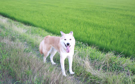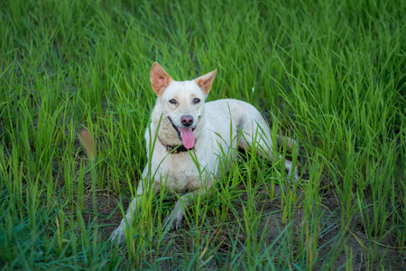 Thai brown stray dog is a animal type mammal and pet so cute playing at beautiful nature garden or farm and looking at something with joy and happy