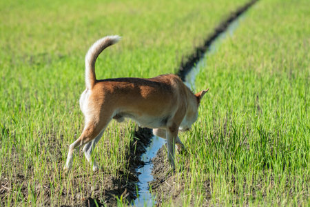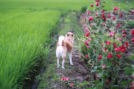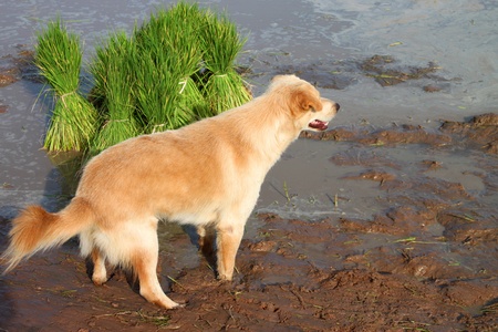 Dog playing on dry rice while Farmer Working at Sunset in Rural Inspired Outdoor Landscape.