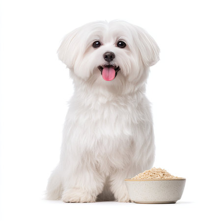 A fluffy white dog sitting next to a bowl of food exudes an adorable and playful demeanor. This image is perfect for pet care and lifestyle promotions.