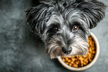 Top view of cute dog feeding from bowl of dog food. High quality photo