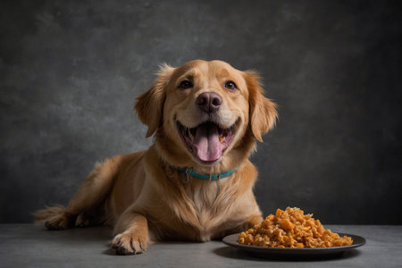 Excited dog happily enjoying his delicious food from a bowl while looking at the camera with joy.