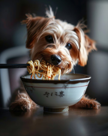 Yorkshire Terrier eating spaghetti in a bowl with chopsticks. Selective focus.