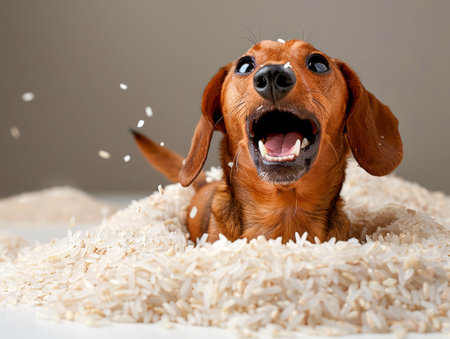 Happy Dachshund Dog Playing in a Pile of Rice Cute Brown Puppy Having Fun Playful Pet Portrait in Food Setting Joyful Animal Expression AI Generative