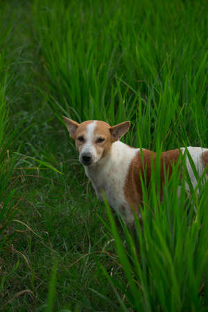 The dog is looking at the camera with a mixture of white and brown color in the grass