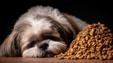 Cute fat dog sad because of excess weight. Modern problem of obesity in pets due to overfeeding with food and treats. Concept of diet and fight against excess weight in dogs and awareness of animal health.