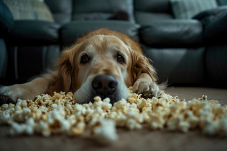 An AI generated illustration of a golden retriever resting head on popcorn on floor