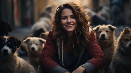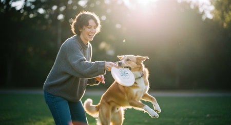 Woman with curly hair is sharing a joyful moment with a dog in a park, highlighting the connection between pets and their owners in a lively environment, AI generated