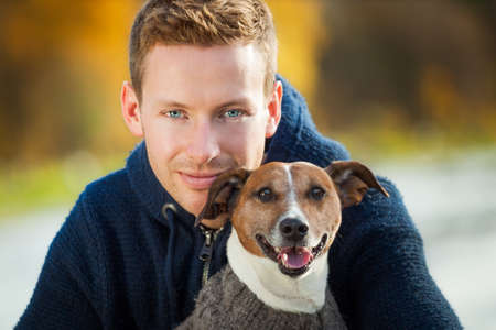 Spoiled self portrait concept: man trying to make a selfie with his funny dog. Young male person and staffordshire terrier posing for a selfie outdoors