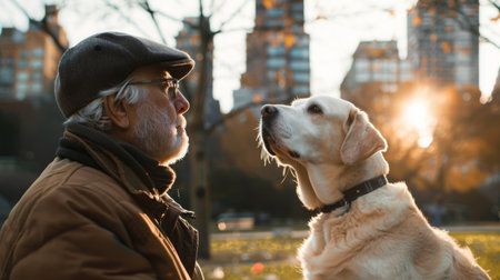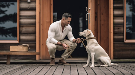 Caucasian man smiling with his loyal purebred retriever outdoors generated by artificial intelligence