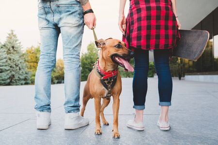 Young people in urban scene walk the dog. Young man with a dog on the leash and young female with a skateboard outdoors - concept of youth culture people being responsible and having a pet