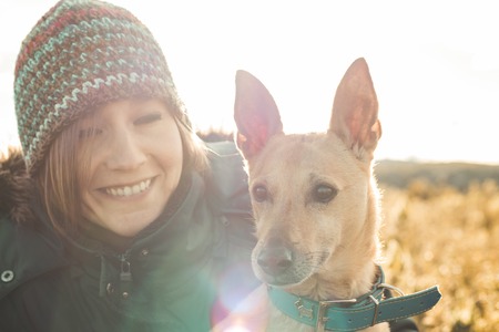 Portrait of a young woman with her dog in the country. Concept of friends between dog and woman
