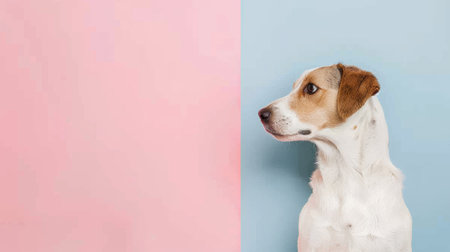A white and brown dog is standing next to a pink and blue wall. The dog appears alert and attentive, looking towards the camera. The wall provides a colorful backdrop for the scene.