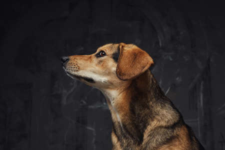 Portrait of a mixed breed dog with a brown collar isolated on a gray background with copy space veterinary clinic concept