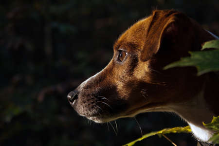 Brown and white dog with perked ears exploring a mysterious foggy forest. Ai generated image