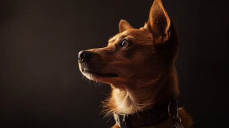 This adorable portrait features a happy brown dog with a playful expression, highlighting its bright eyes and tongue, set against a dark background to emphasize its charm.
