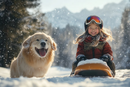 Smiling girl and golden retriever enjoying winter wonderland on sled