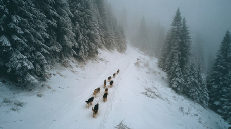 A group of dogs walks along a snowy surrounded trail by tall evergreen trees, while fog envelops the mountains, creating an enchanting winter landscape.