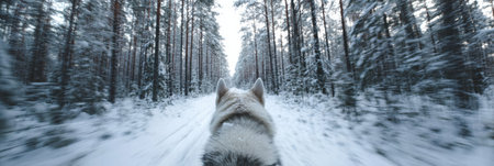 Husky sled dog racing in winter forest. Panoramic banner