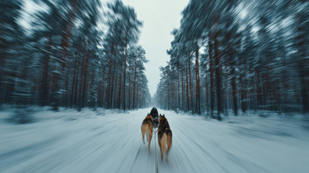 Two dogs race down a snow-covered path in a winter forest, surrounded by towering pine trees and a serene atmosphere.