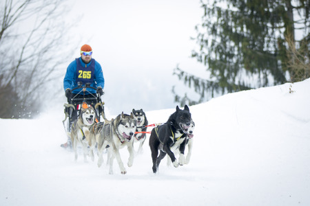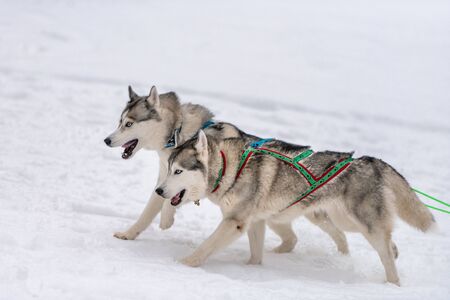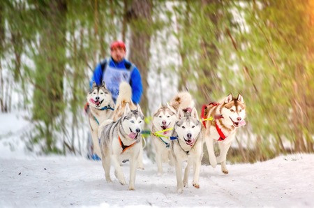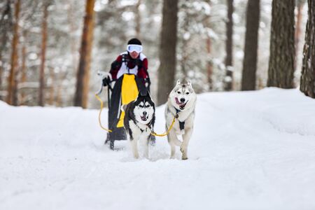 Siberian husky sled dog racing. Mushing winter competition. Husky sled dogs in harness pull a sled with dog driver.