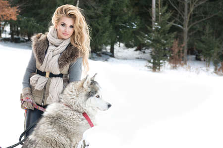 young woman winter clothes walking the dog husky in the snow winter holidays