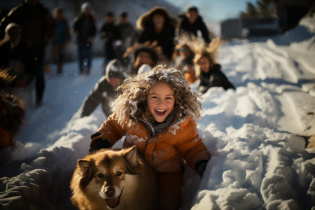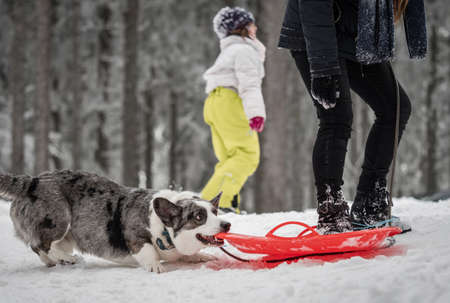 Portrait of a joyful girl and a dog going down a hill in the snow. Winter fun.