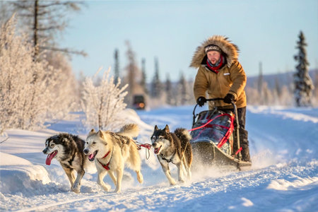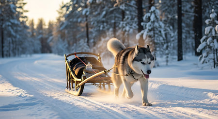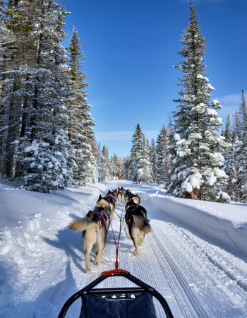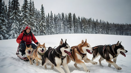 Experience the thrill of a dog sledding adventure as a team of energetic dogs pulls a sled through the snow-covered forests, creating an exhilarating winter experience.