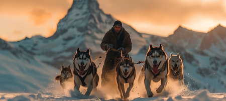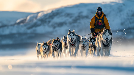 Sled dog team racing through snow at sunrise with golden light illuminating the trail in a winter wilderness setting